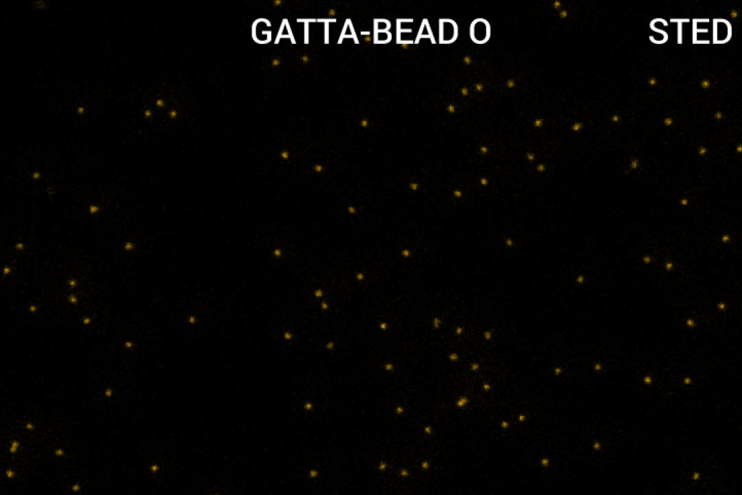 Our GATTA-Beads O labeled with ATTO 594 were imaged on an Abberior 2C STED 775 QUAD Scan system and created eye-catching images with highest quality and resolution even for raw data (no deconvolution applied).